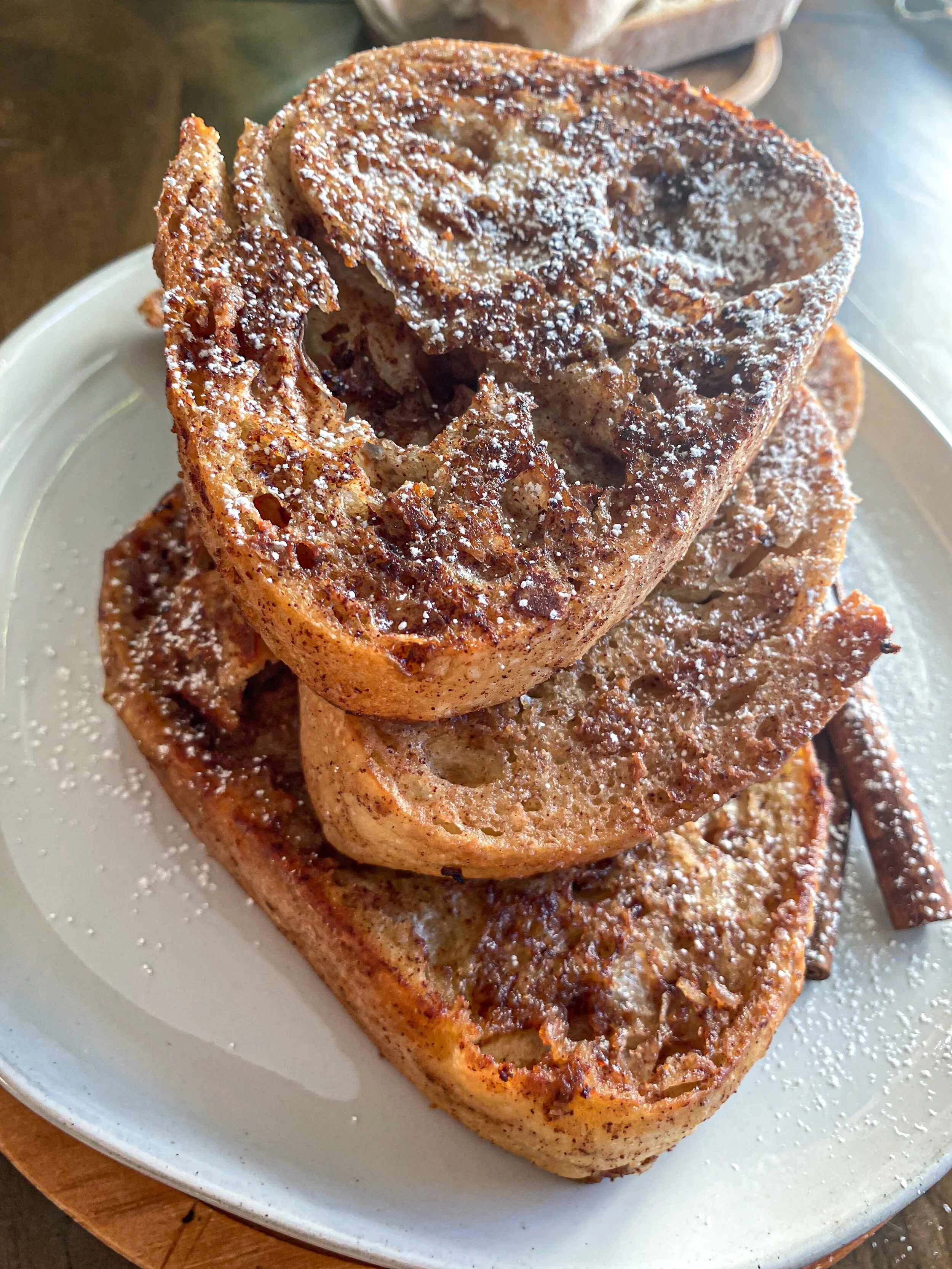 - Add powdered sugar and drizzle maple syrup or oatmeal cream cheese glaze over top of the french toast