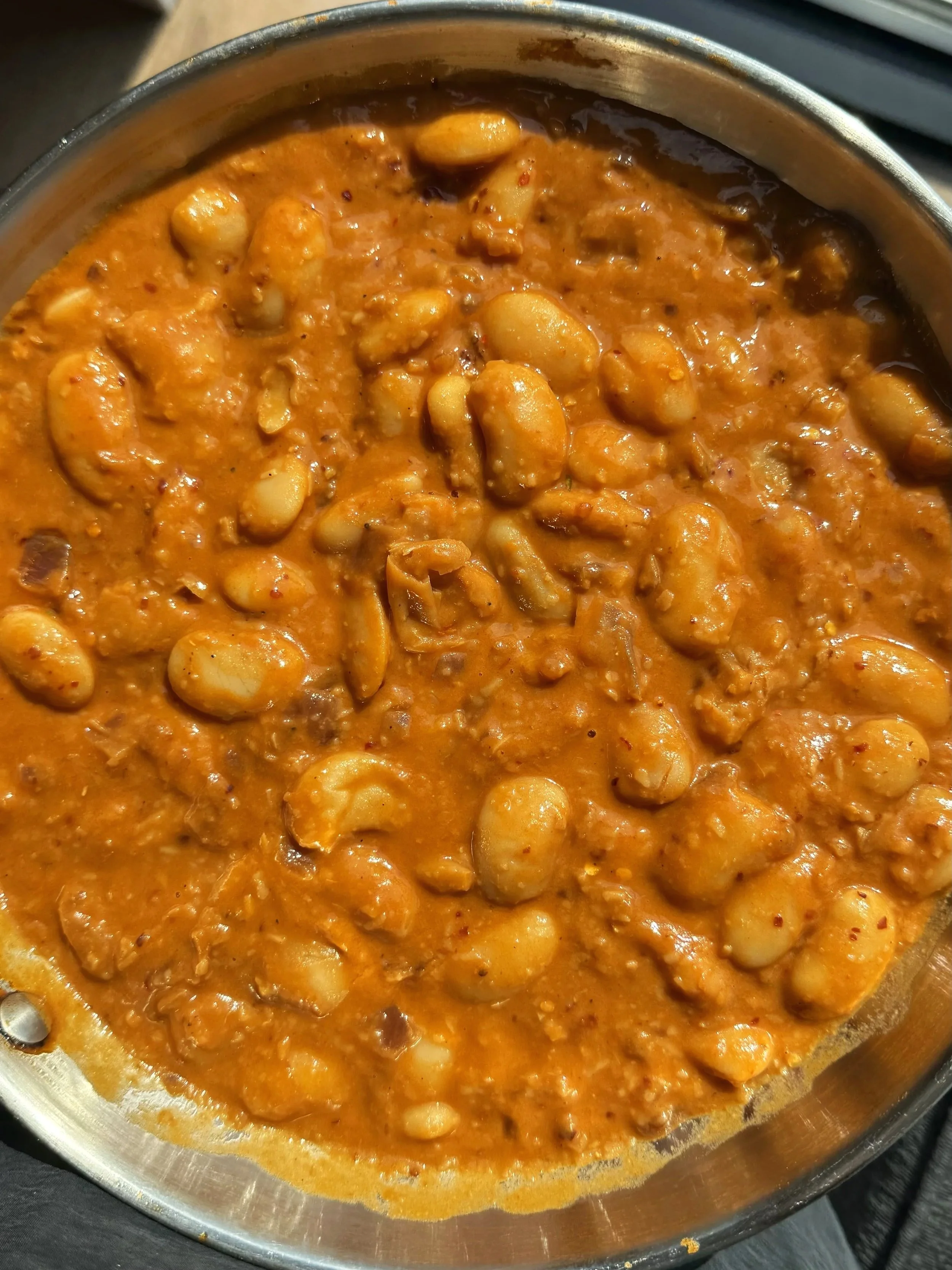 - Add the drained butter beans and stir well. Reduce heat to low-medium, cover with a lid, and simmer for 10-15 minutes until the sauce has thickened slightly.