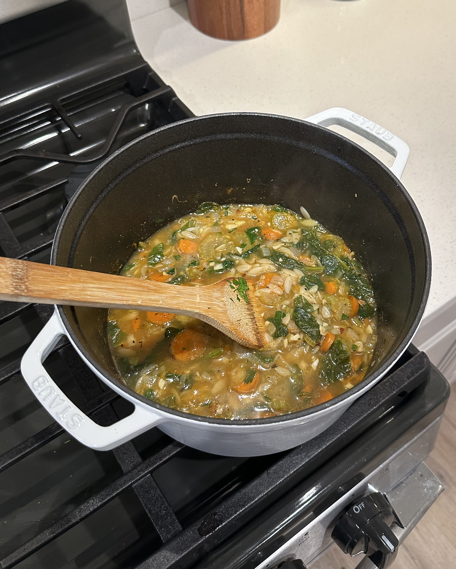 Pour in the vegetable broth and stir well. Cover and simmer for 20 minutes, stirring frequently to prevent orzo from sticking.